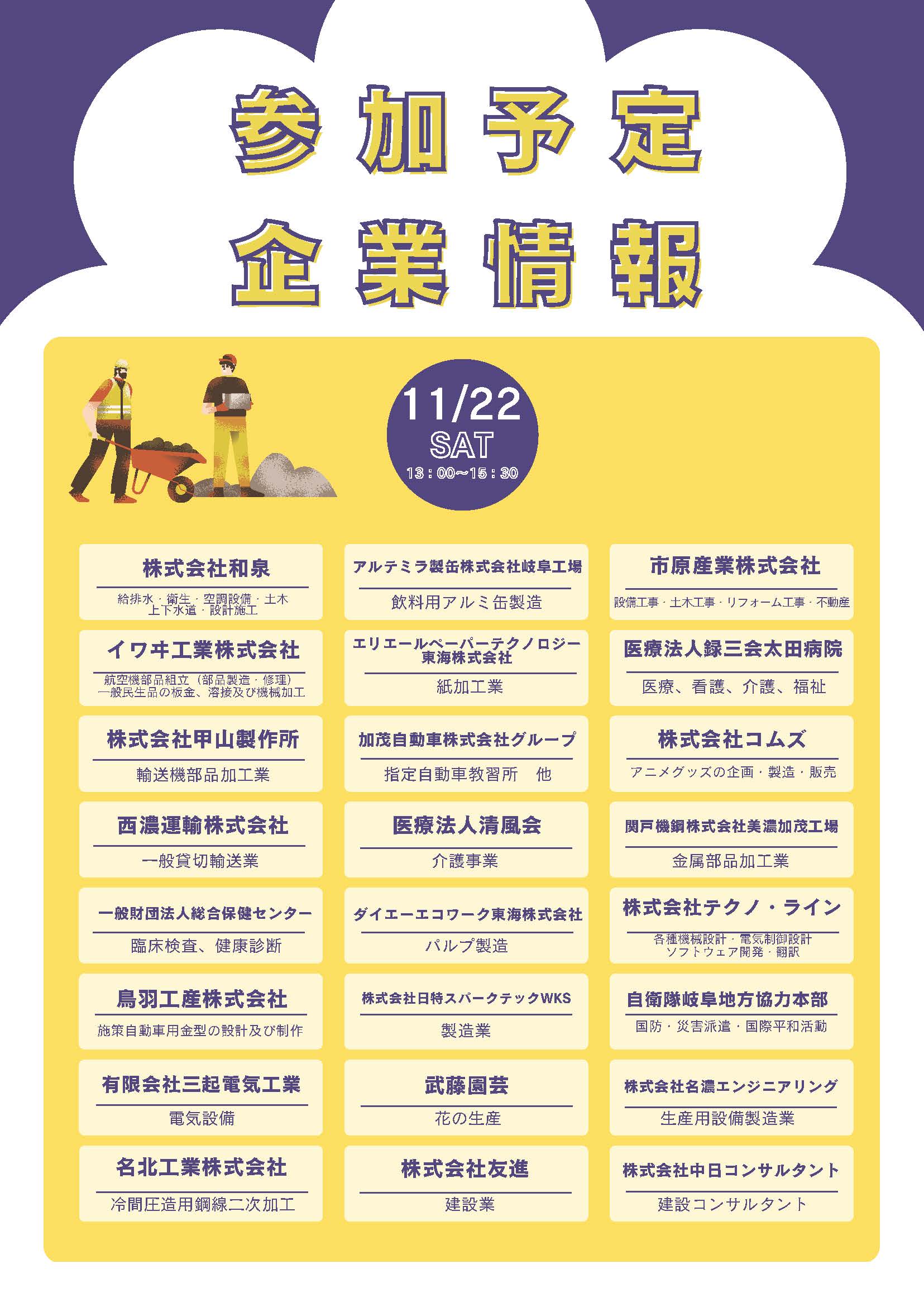 イベント 求職者の方へ!「合同企業説明会」にぜひお越しください! 日程 令和7年11月22日(土)13時00分~15時30分 開催場所 シティホテル美濃加茂 対象者 求職中の方 参加費 無料 留意事項 ・履歴書不要 ・相談コーナーもございます お問い合わせ先 ■美濃加茂商工会議所 〒505-0042 岐阜県美濃加茂市太田本町1-1-20 TEL 0574-24-0123 FAX 0574-24-0120